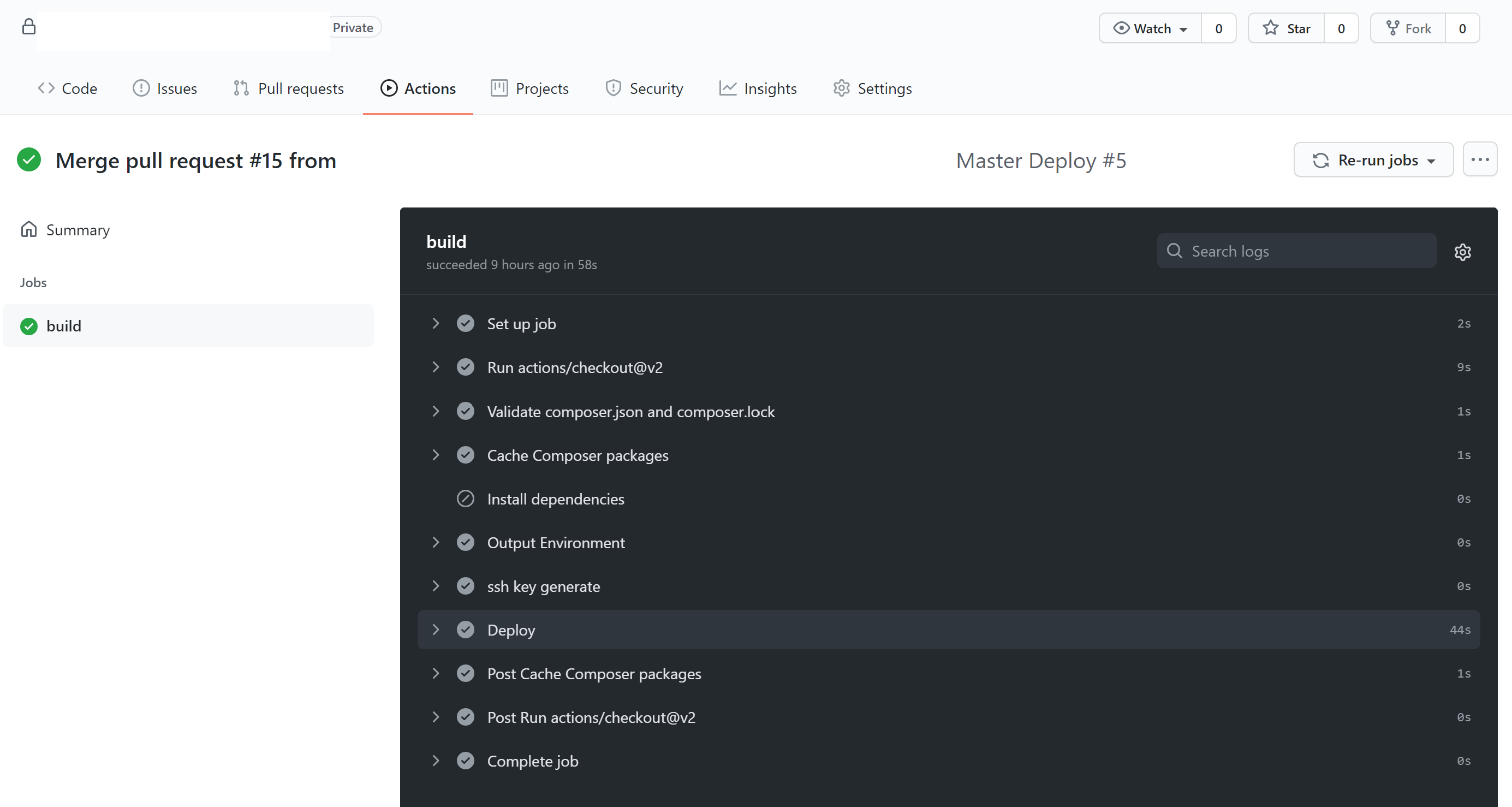 毎回デプロイのたびにcomposerでライブラリを取ってくると時間もかかってしまいますが、このキャッシュする書き方によってその時間が短縮されcomposer installの箇所が速くなります。