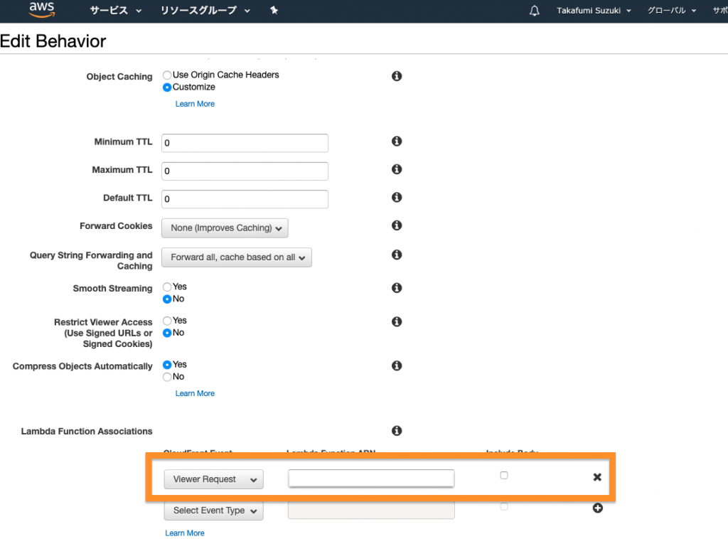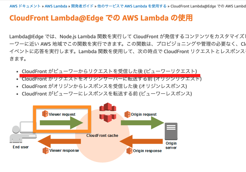 CloudFrontのところに「オリジンリクエスト」のところで設定します。つまりCloudFrontからオリジンサーバーに対してのところで処理を挟むわけですね。