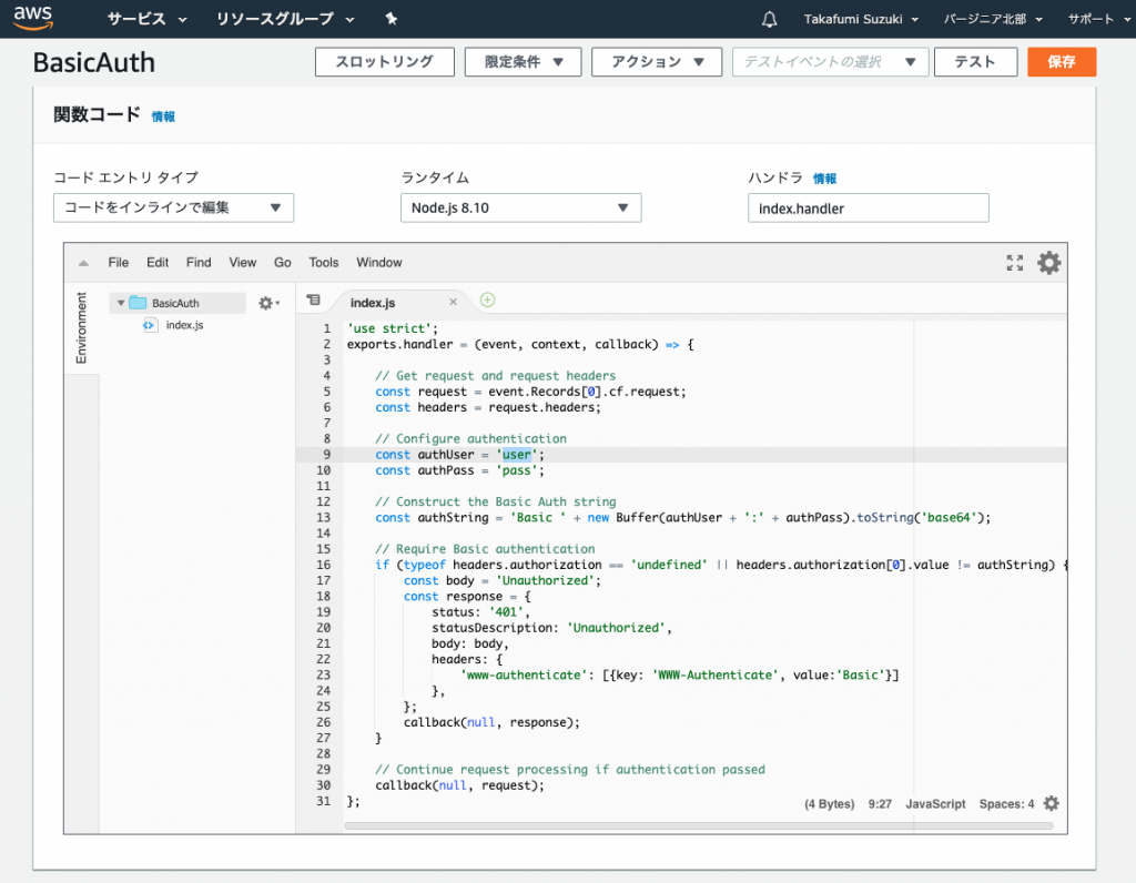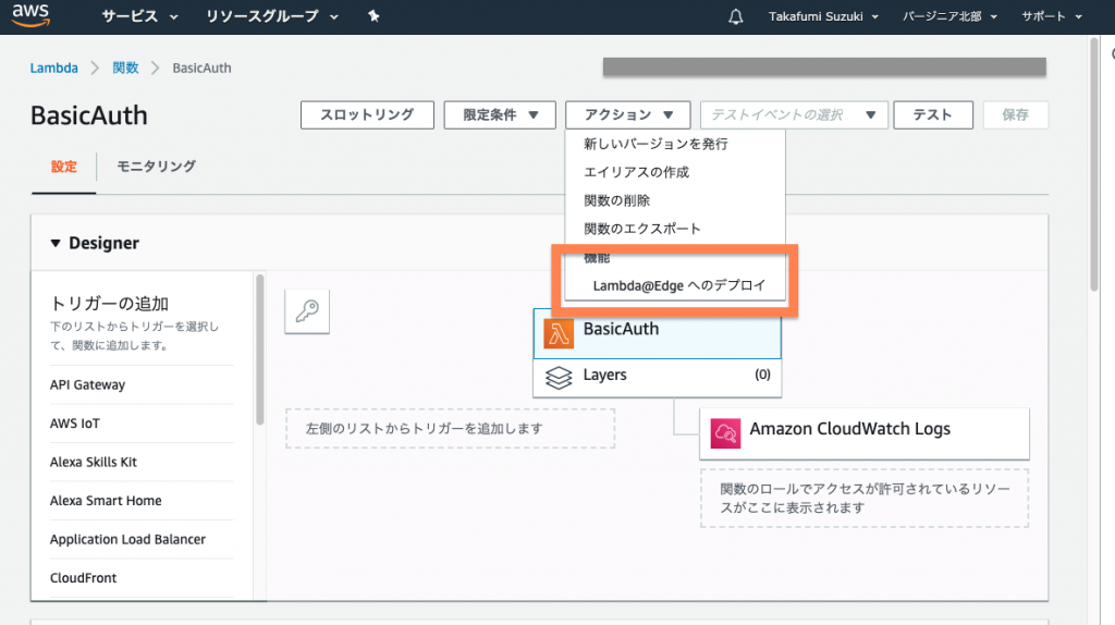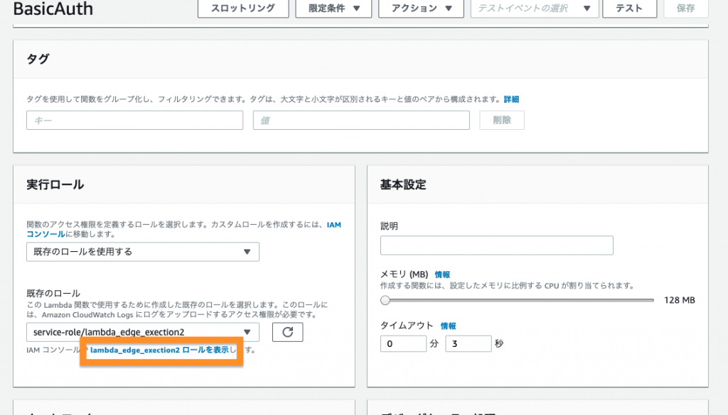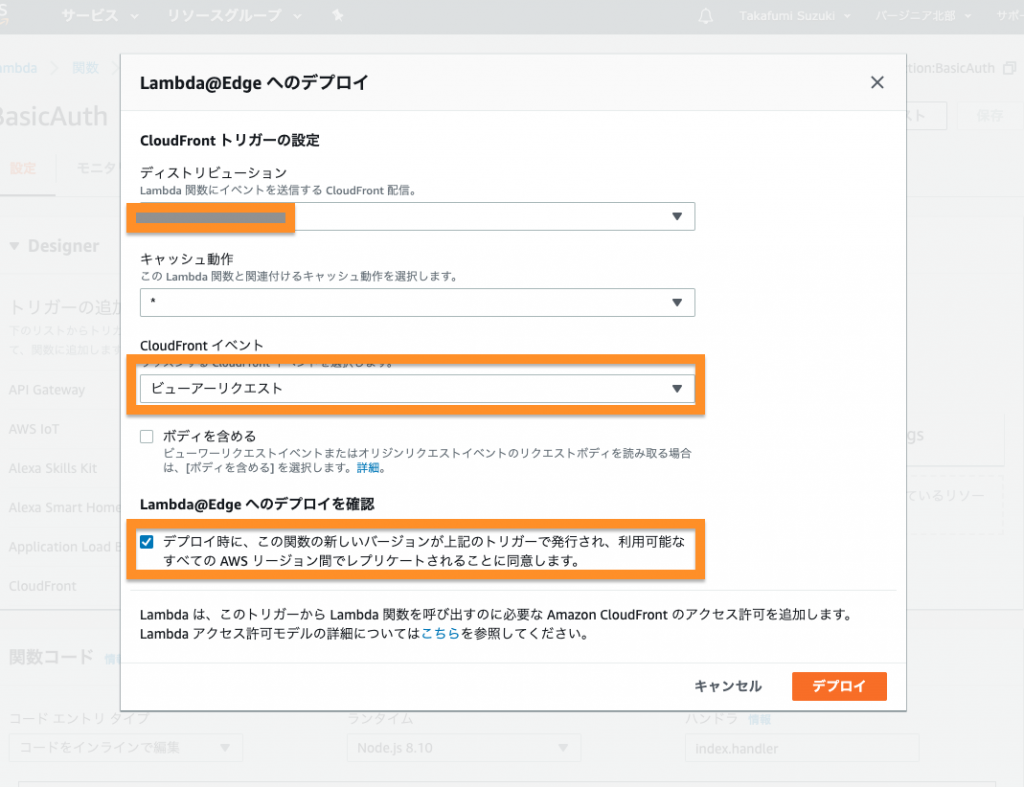 CloudFrontイベントが「ビューアリクエスト」を選択するのは、エンドユーザーからリクエストが来たときに、このLambda関数が発動してBASIC認証を動作させたいからです。