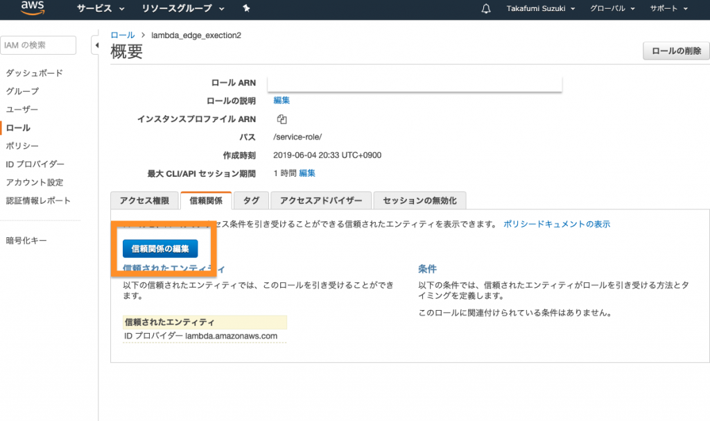 対象のロールの「信頼関係」タブにて、「信頼関係の編集」を押下します。