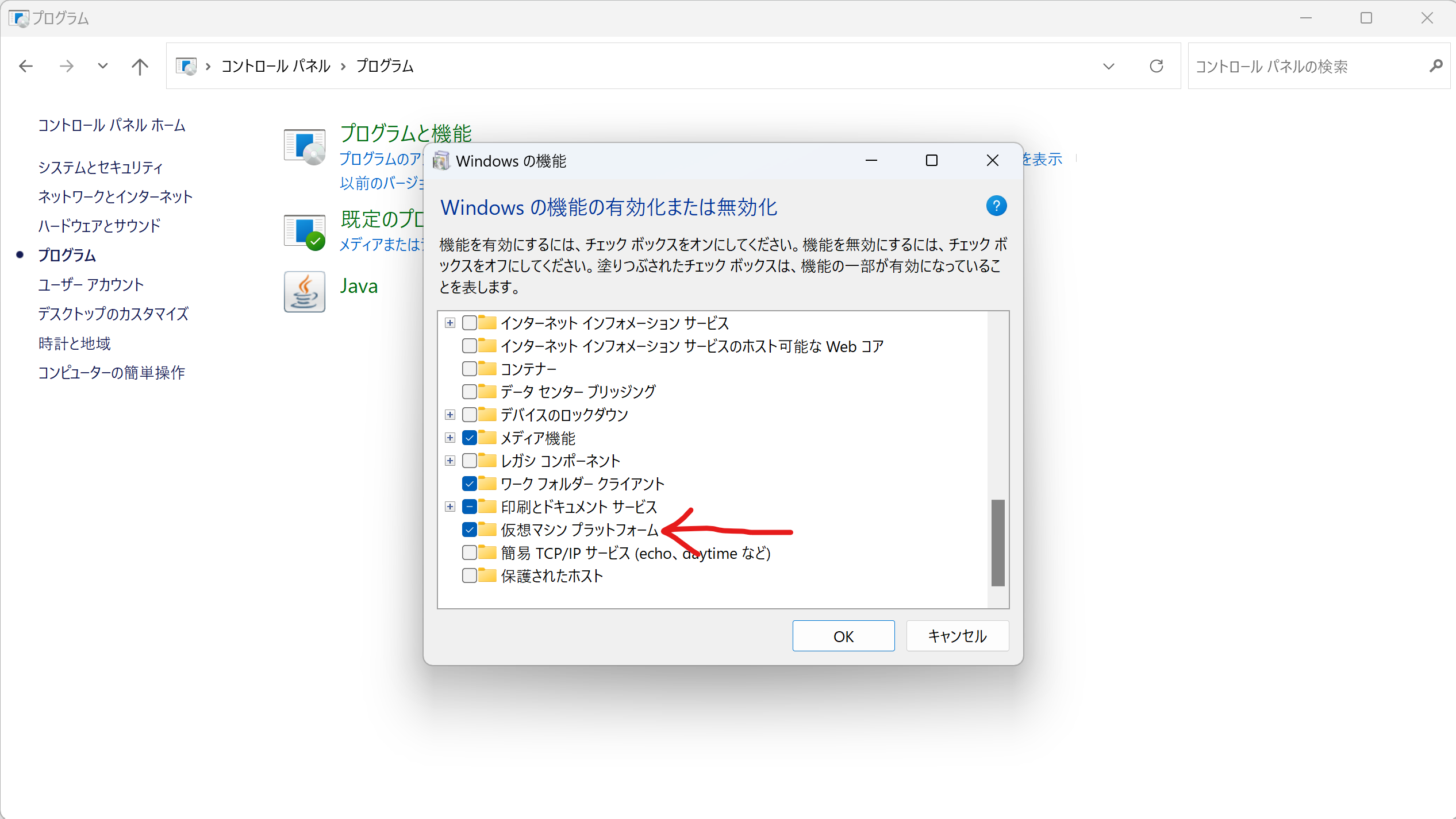 次に出てくるダイアログで「仮想マシンプラットフォーム」にチェックを入れてOKをクリックして再起動します。