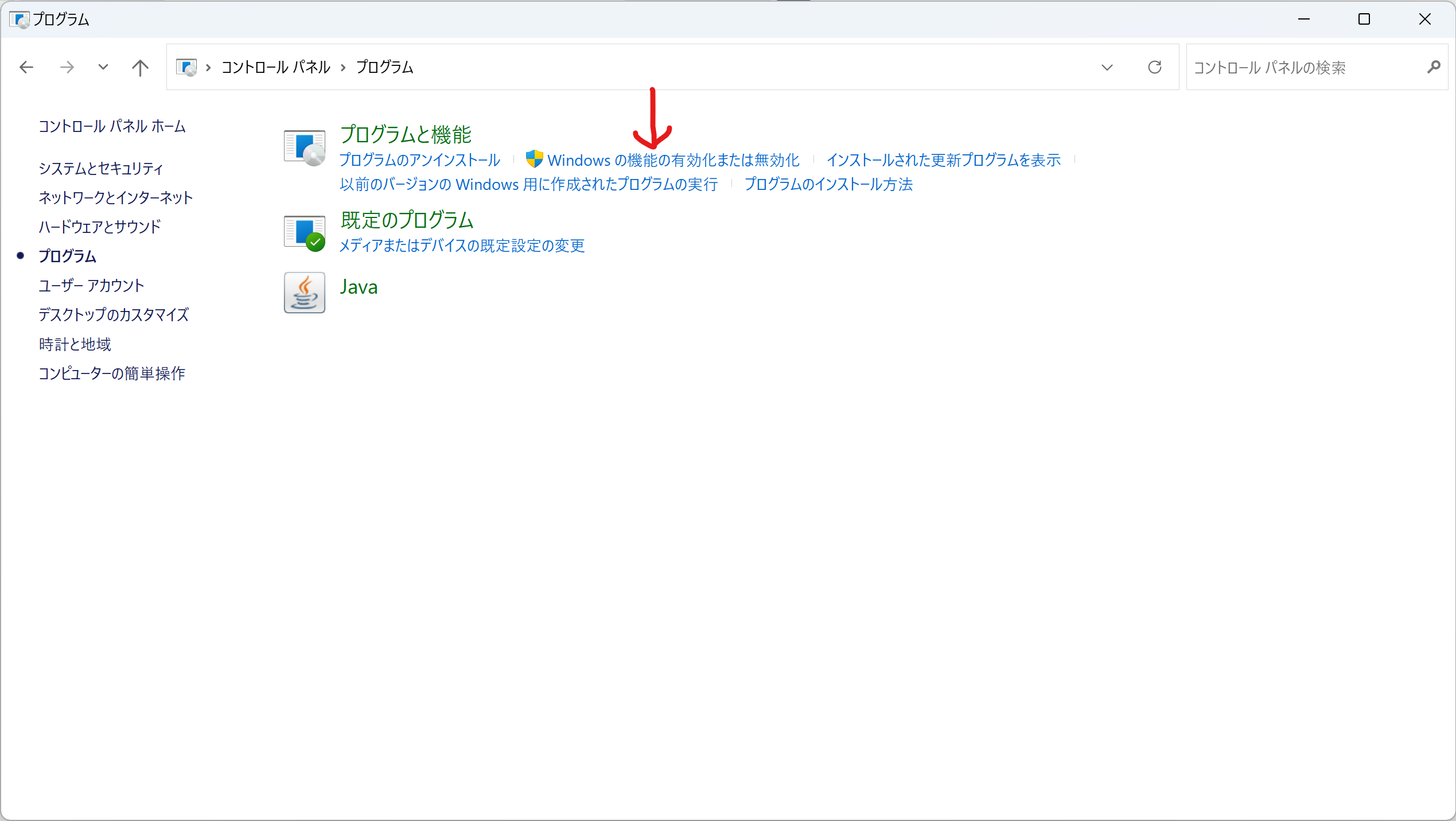 コントロールパネルの以下画面で「Windowsの機能の有効化または無効化」をクリックします。