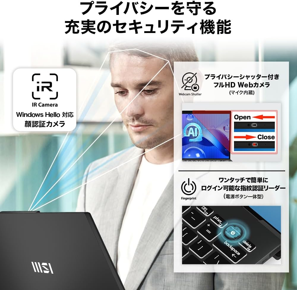 セキュリティ面でも抜かりなく、顔認証+指紋認証の両対応。さらにプライバシーシャッター付きWebカメラまで備えており、オンライン会議でも安心して使えます。