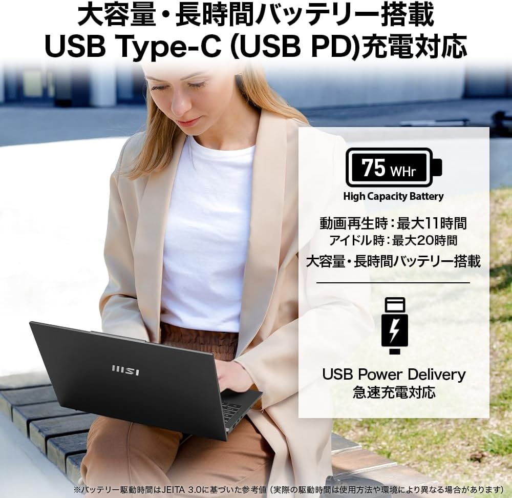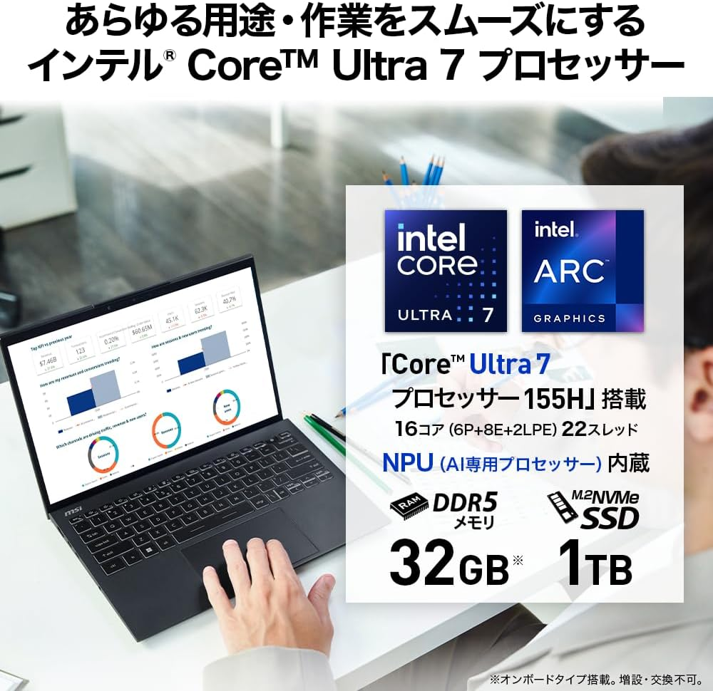 CPUにはAI専用NPUを内蔵したIntel Core Ultra 7 155Hを搭載してるので、画像・動画編集、マルチタスクも余裕でこなせる高性能を発揮しつつ、省電力制御でバッテリー持ちも優秀です。