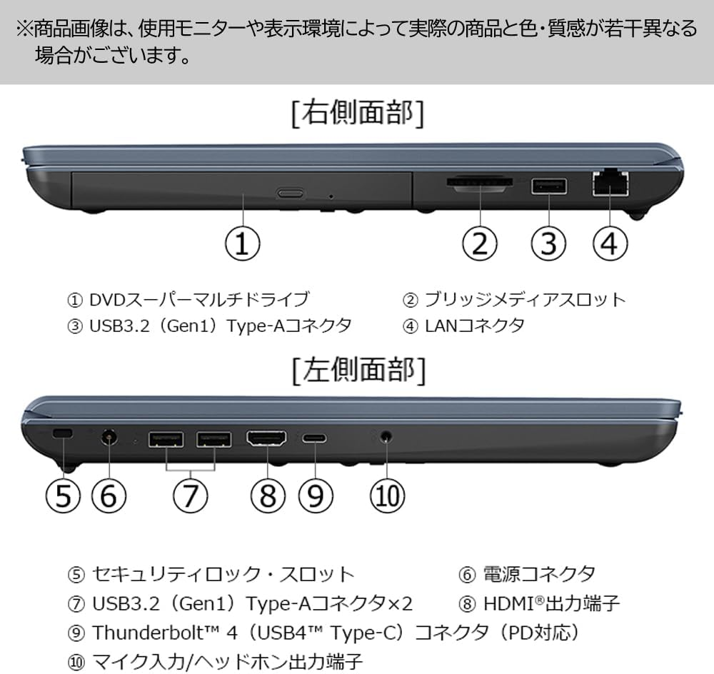 拡張性もちゃんとしてます。USB-Aが3ポート、Thunderbolt 4(USB4 Type-C)対応ポートが1つ、HDMI、有線LAN、SDカードスロットも搭載されていて、プリンタや外付けディスプレイとの接続もスムーズに対応できます。
