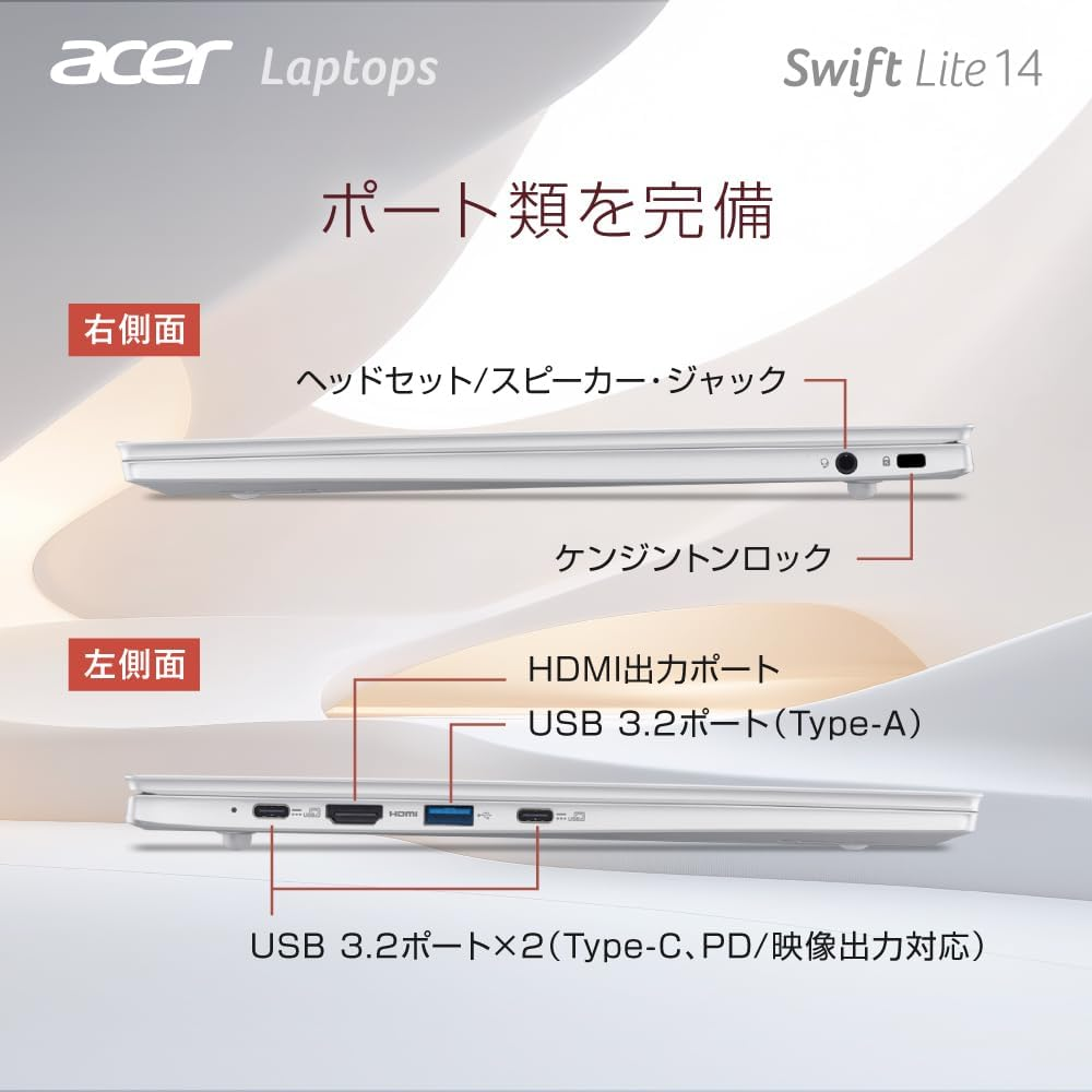 まとめると、Swift Lite 14は「軽さ・見た目・実用性(ポート)」の3点で満足度を取りにくるモバイルノート。持ち歩く生活が多いなら、かなり“ちょうどいいPC”になります👍