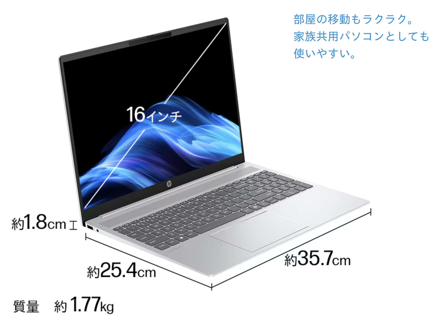 HP OmniBook 5 16-afは、16インチの大画面タッチディスプレイが一番の魅力です。自宅デスクでExcelとブラウザを並べても窮屈に感じにくいのはやっぱり快適😉 指でサッとスクロールできる直感操作も地味に便利です。約1.77kgあるので毎日持ち歩くのは正直重めですが、家メインなら十分アリ。コスパ重視で広い画面がほしい人にちょうどいい一台です😊