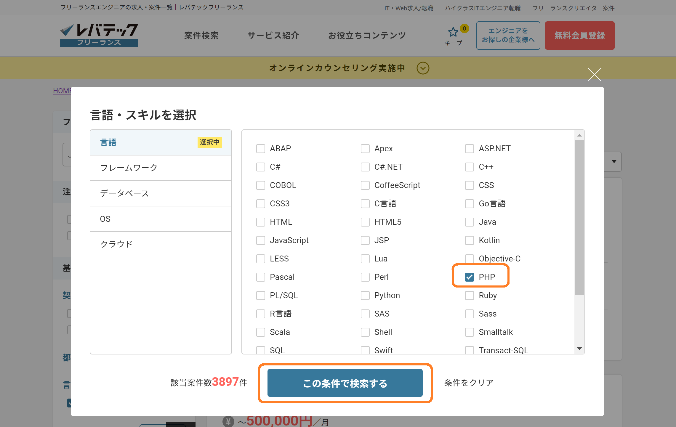 それは、エンジニアのフリーランス仲介サービス「レバテック」等で、プログラミング言語別の案件数の検索で知ることが出来ます。