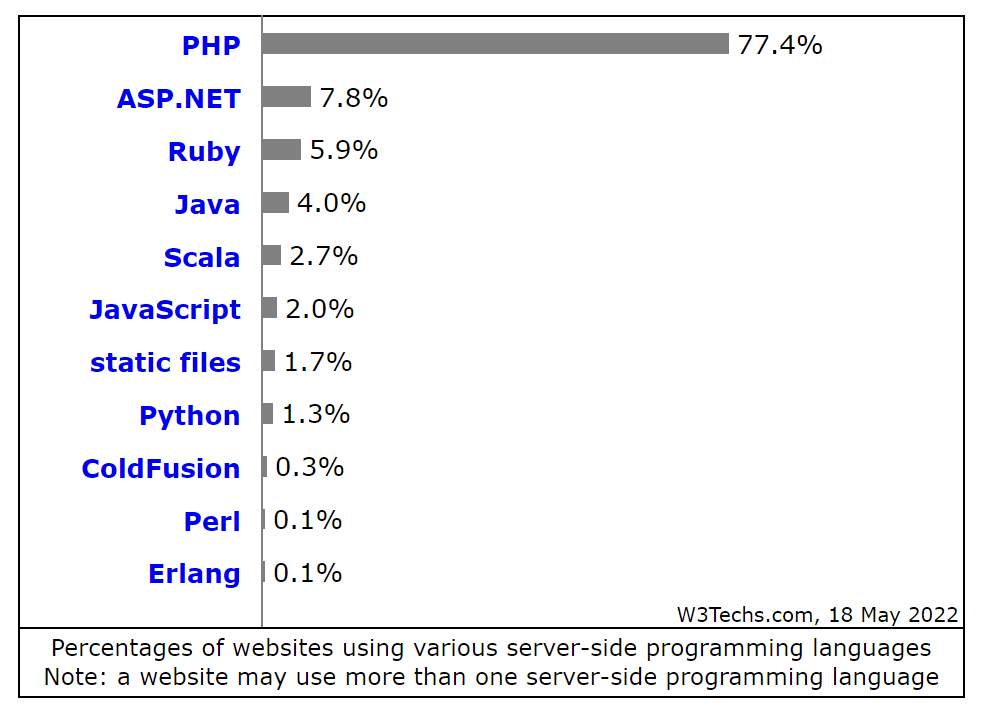 海外のプログラミングに関する統計をしている「W3Techs」で、Webシステムで利用されているプログラミング言語の利用統計のここ数年の結果がこちらです↓↓