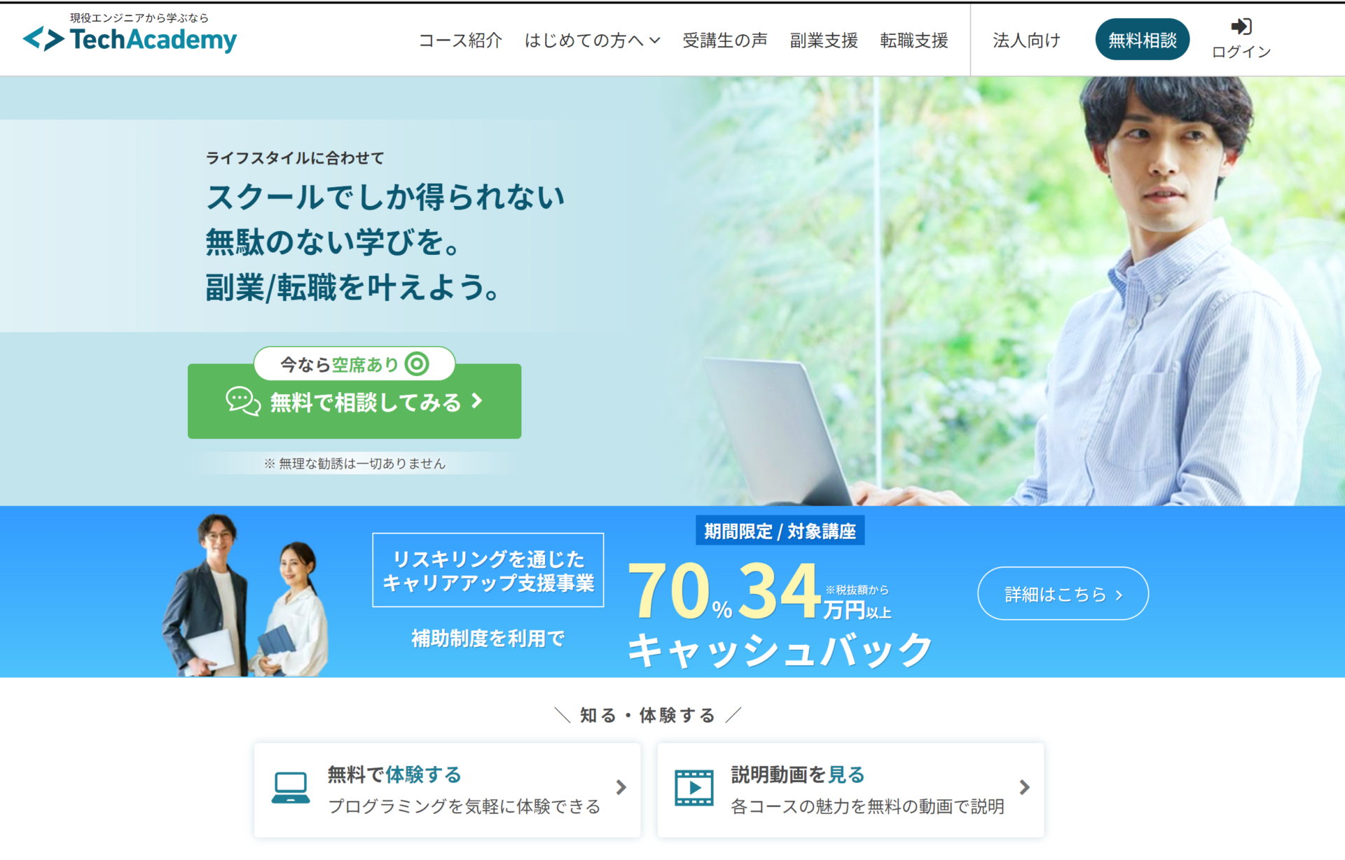 | おすすめコース | 「プログラマー入門コース」+「PHP講座」 (実質322,432円* 「Reスキル講座」+「PHP講座」 (実質464,760円* |