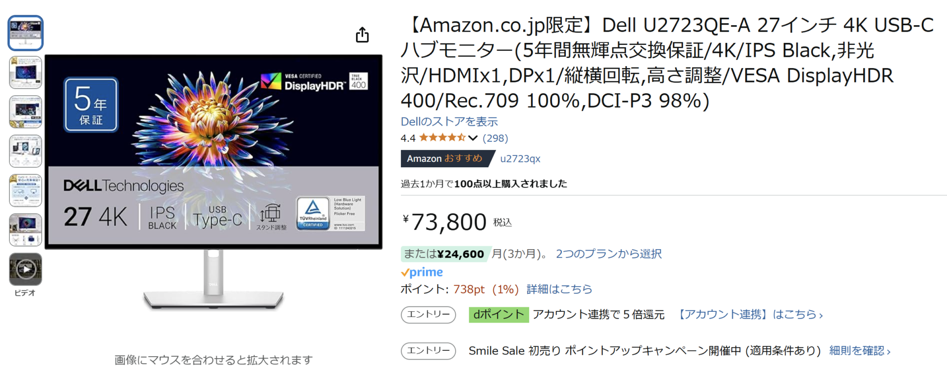 | U2720Q | DELL 公式サイト | 106,480円 |