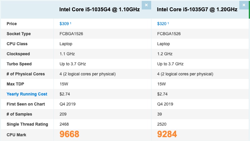 Surface Pro 7 は左のIntel Core i5-1035G4 です。