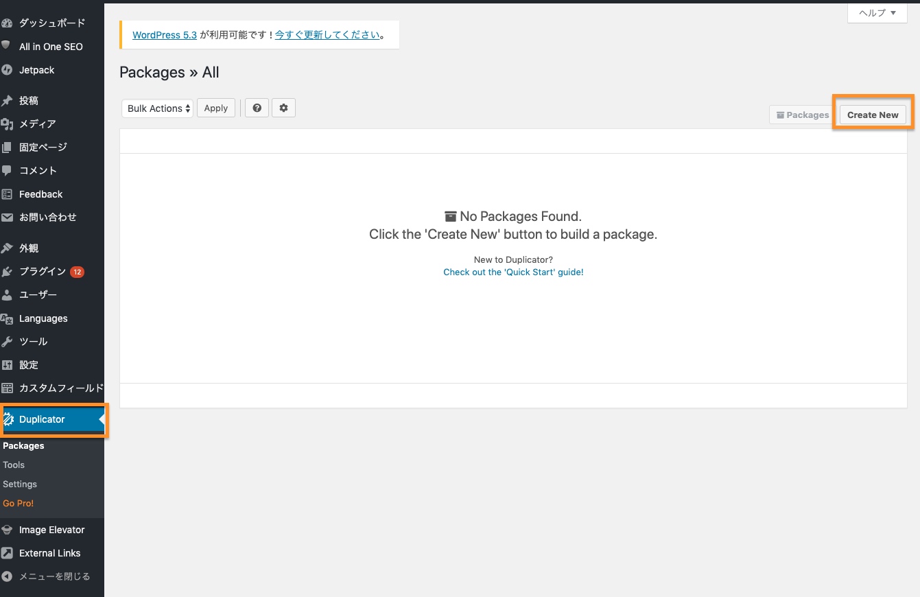 メニューの「Duplicator」でアクセスしたページにて「Create New」を押下します