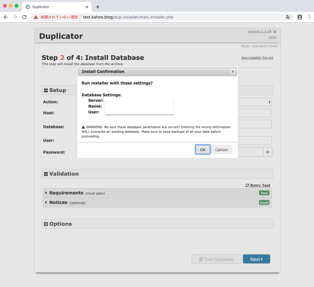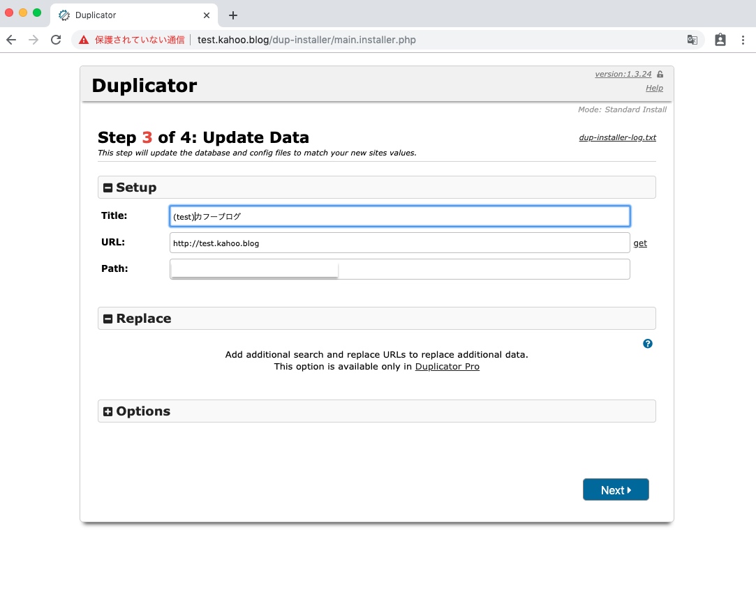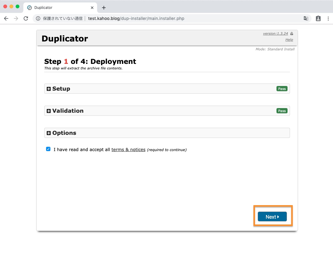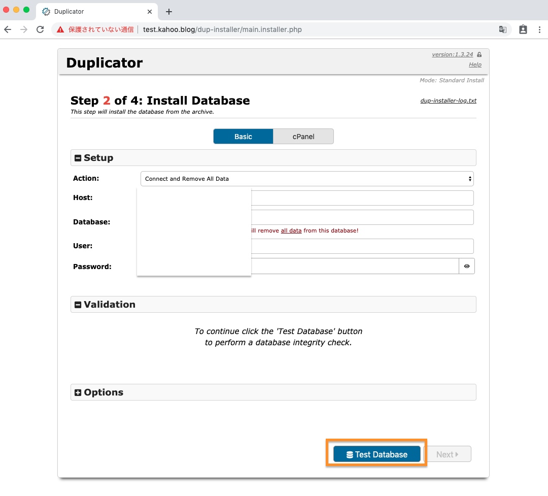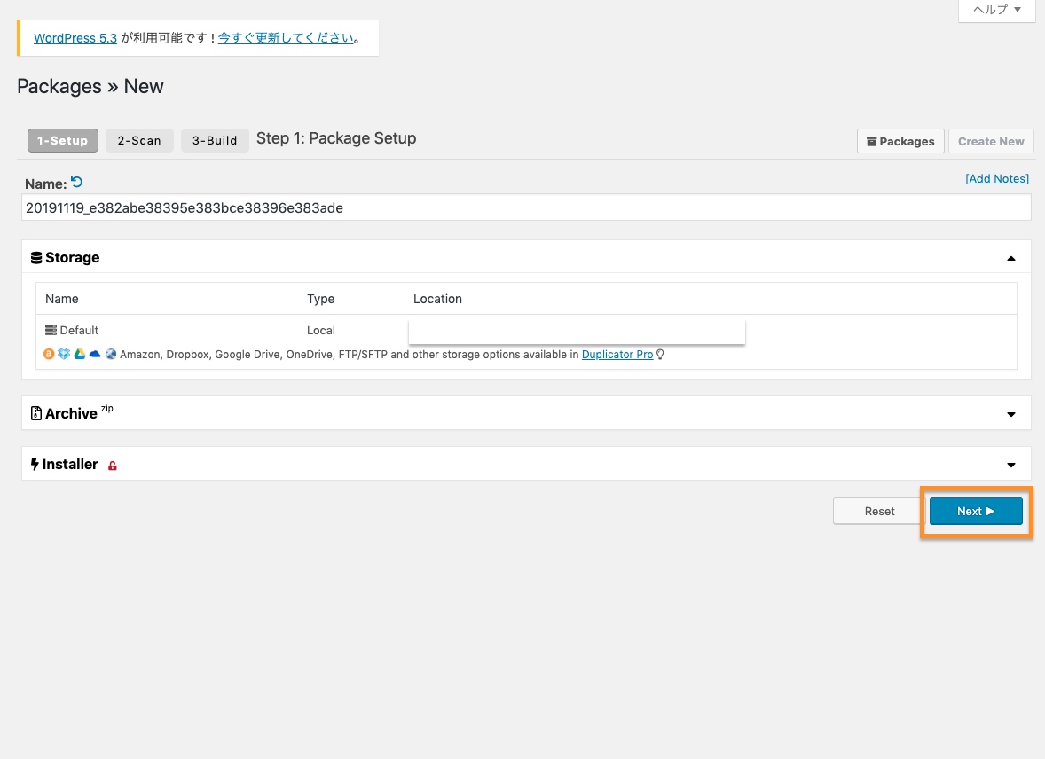 Duplicatorのセットアップ画面が表示されます。Optionsなどはデフォルト設定でよさそうです。
