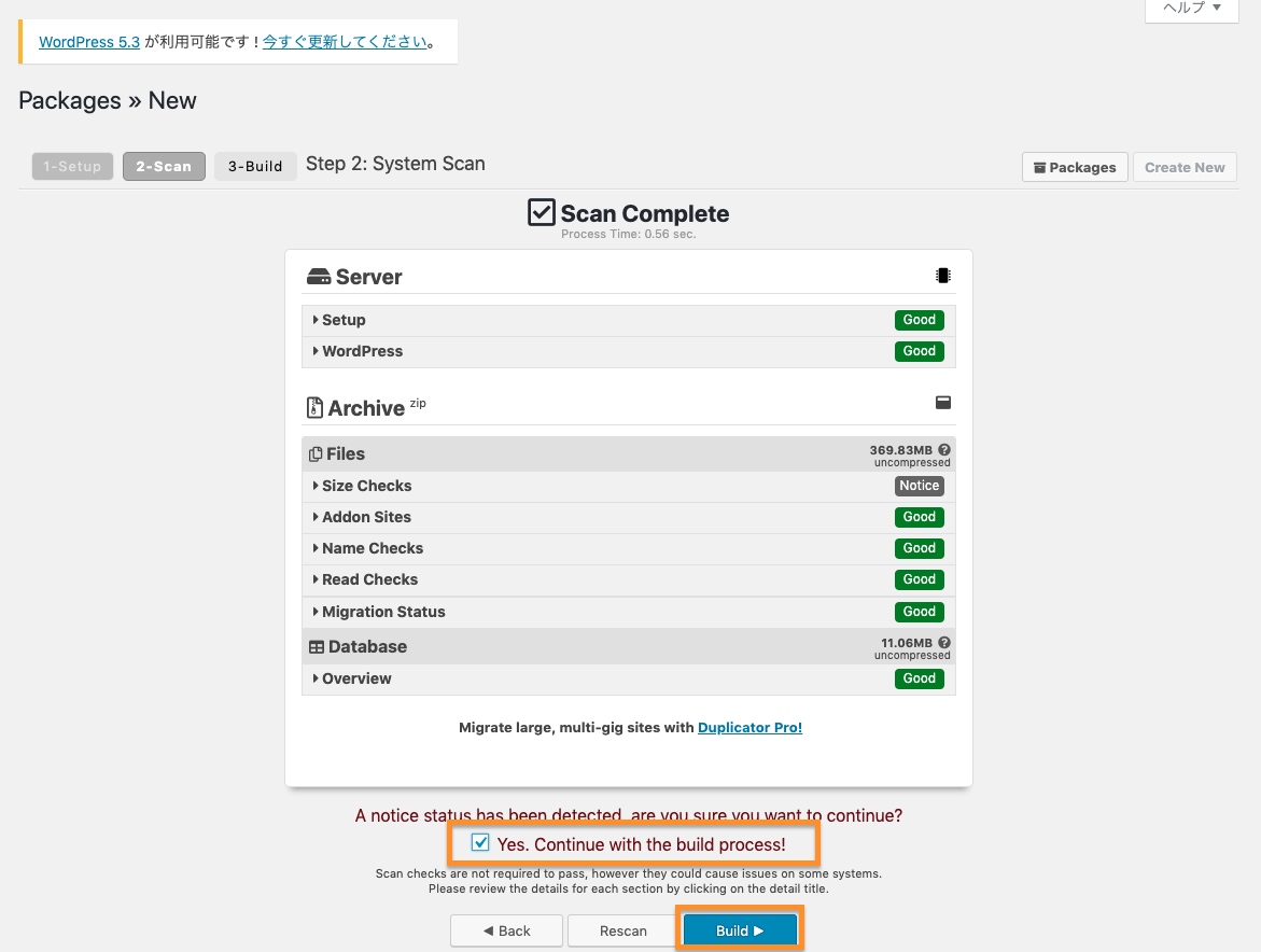 問題ないならば「Yes, Continue with build process!」のチェックを入れて「Buid」を押下します。