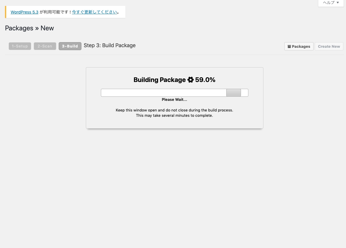 パッケージ化が始まります。規模にもよりますが個人ブログくらいなら大体1分くらいです。