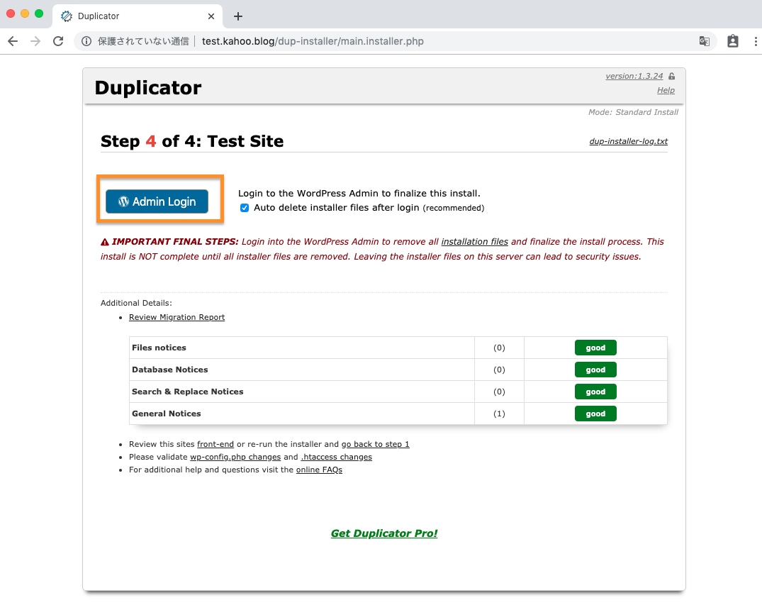 最後に管理者ログインをするとインストーラーなどを削除してくれるようです。