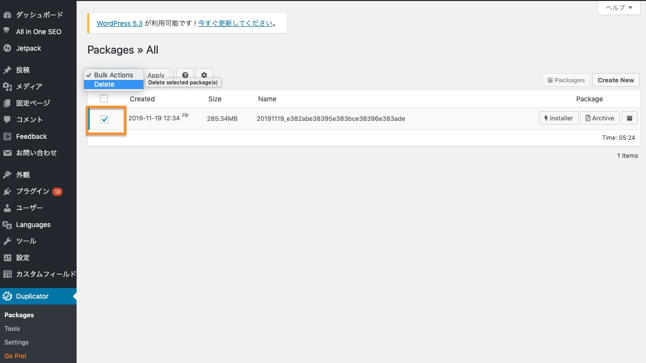 コピー元サイトでDuplicatorのパッケージの削除
